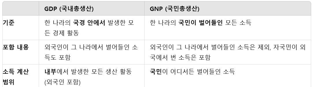 GNP: 한 나라 국민이 벌어들인 모든 소득을 계산해요. 국민이 외국에서 번 돈도 포함되고, 외국인이 그 나라에서 번 돈은 제외돼요.