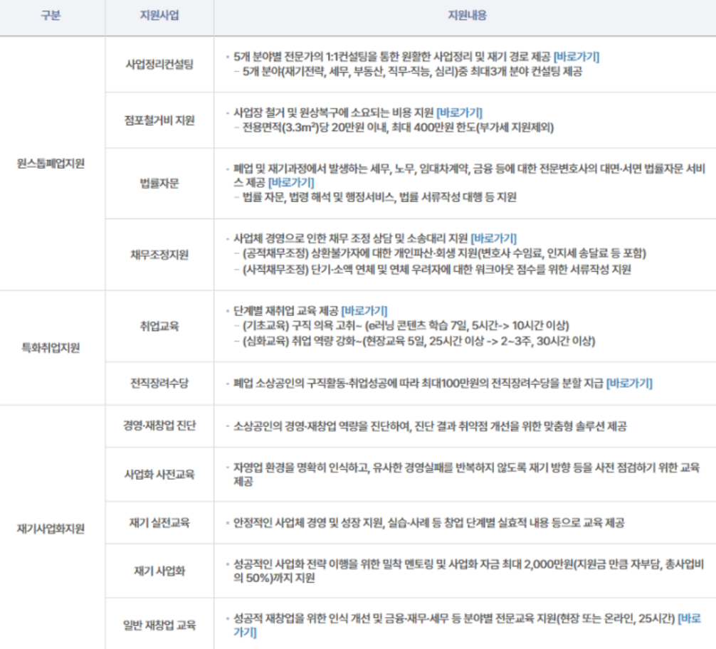 따라서 폐업할 때 현금만 한 번 지원해 주는 것이 아닌, 재기를 돕는 실질적인 지원 프로그램이라고 할 수 있습니다.