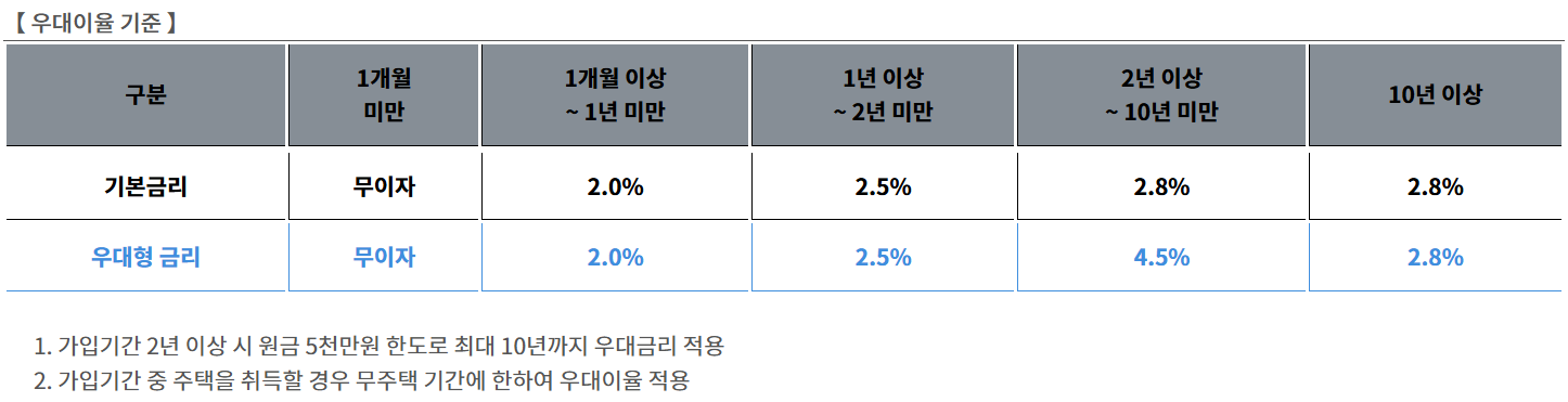 가. 이율이 좋다: 일반 주택청약종합저축 이율에 1.7% 가산 (무주택기간만큼 적용)