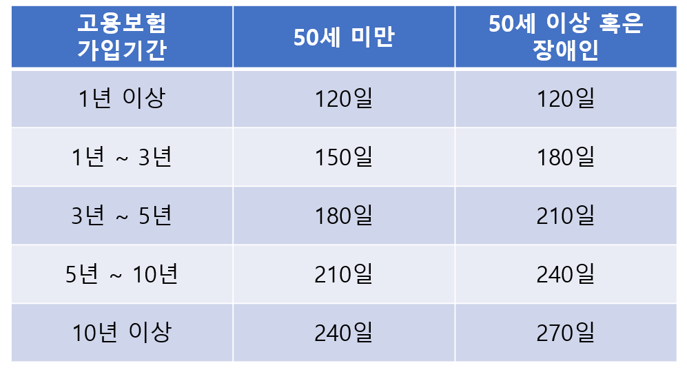 - 실업급여 지급기간은 가입자의 나이, 장애 여부, 고용보험 가입 기간에 따라 120일부터 270일로 각기 다른데요. 자세한 내용은 아래 표에 정리해 놨으니, 참고 부탁드립니다.