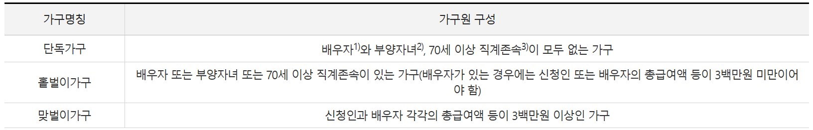 - 가구원이 소유하고 있는 재산합계액이 2.4억원 미만이어야 합니다.