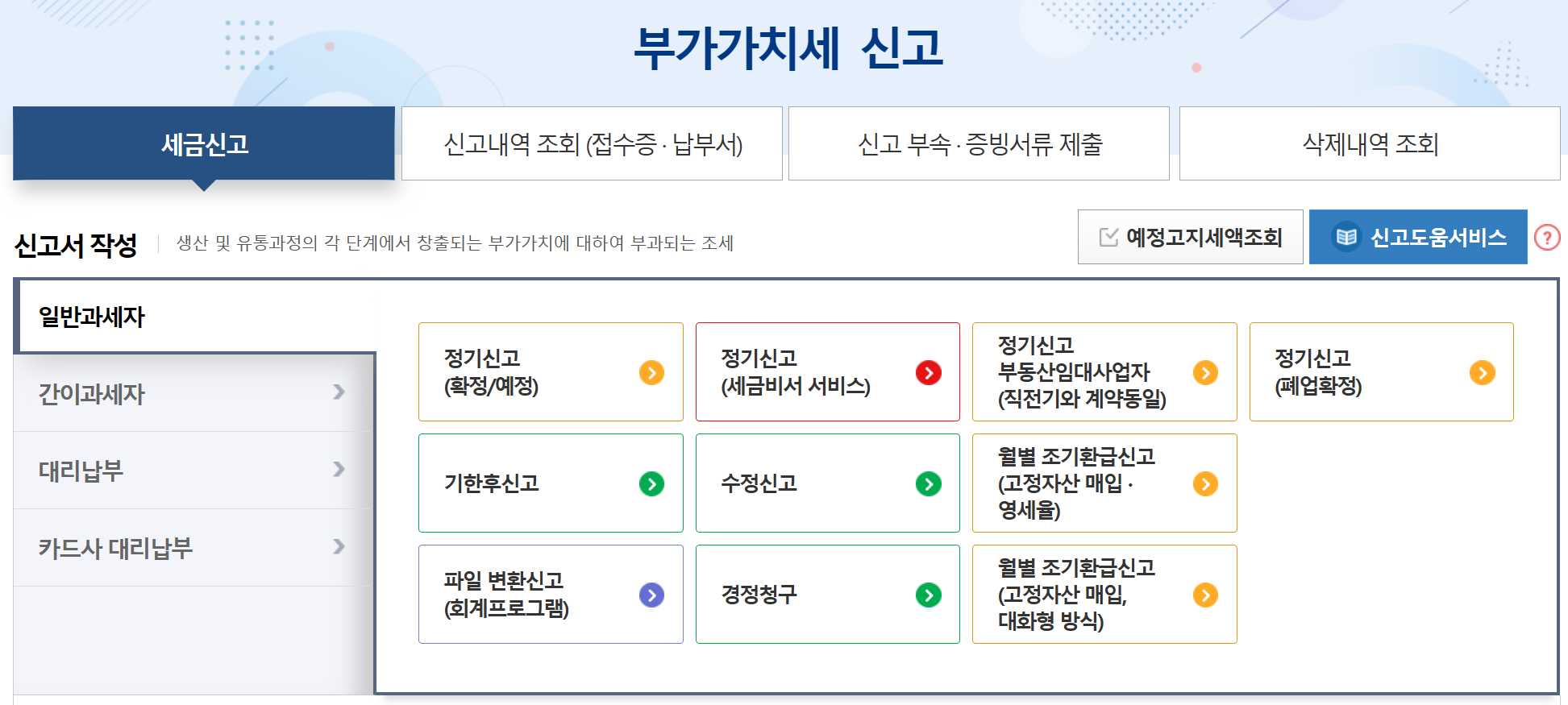 - 일반과세자와 간이과세자는 부가가치세의 퍼센티지가 다른데요. 당연히 간이과세자가 부가가치세를 훨씬 적게 내고 일반 과세자가 더 많이 냅니다. 우선 오늘은 일반과세자 기준으로 설명드리겠습니다. 일반과세자에서 정기신고(확정/예정)를 클릭합니다.
