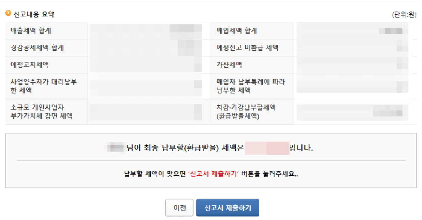 - 이제 상기 단계까지 하셨다면 부가세 신고가 거의 완료된 상태인데요. 마지막으로 총납부할 세액을 확인한 후에 신고서 제출하기를 클릭합니다. 클릭하면 부가가치세 신고서 접수증이 나오는데, 접수 상세내용 확인하기에 체크합니다.