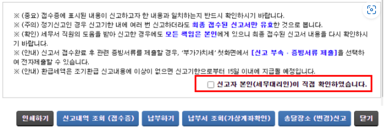 - 상세내용을 확인하고 신고자 본인(세무 대리인)이 직접 확인하였습니다.에 체크를 한 후에 납부 조회(가상계좌확인)를 클릭하면 납세자용 영수증이 나오고 영수증에 나오는 계좌번호에 금액을 납부하면 부가세 신고가 완료됩니다.