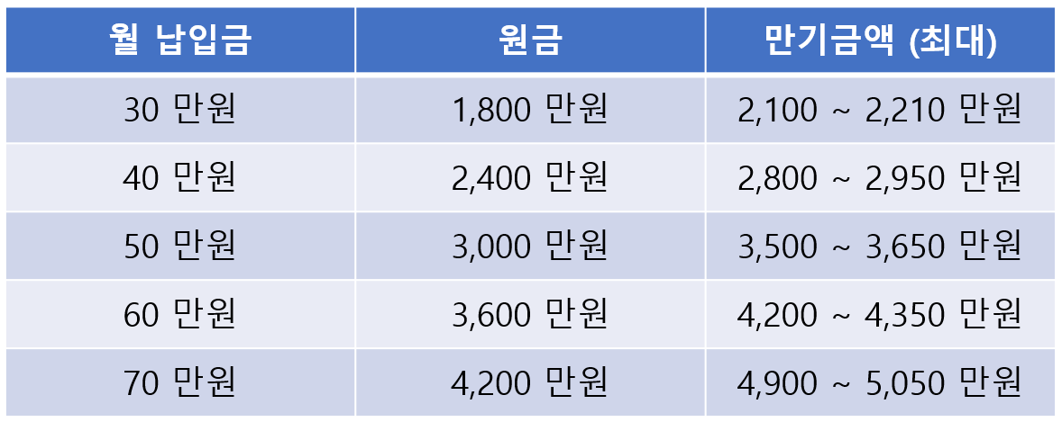 - 대략적으로 최대 금리를 받는다고 가정하고 각각의 월 납부액에 따른 원금과 만기금액(최대)에 대해서 표로 정리해 보았습니다. 개인에 따라 금리가 다르고 월 납부액도 다르겠지만 대략적으로 이 정도 받을 수 있구나 하고 참고하시면 도움이 되실 듯해요. 한눈에 봐도 만기금액에서 혜택을 많이 볼 수 있다는 것을 알 수 있습니다.