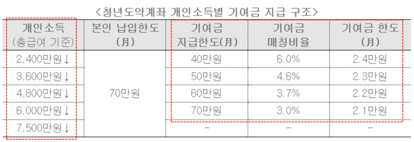 - 표를 보시면 기여금이 나와있죠? 기여금은 정부에서 지원해 주는 금액입니다. 예를 한 번 들어보겠습니다. 내가 만약 개인소득이 3,600만 원이라면 본인이 납입할 수 있는 금액은 최대 70만 원이고 기여금 지급한도는 50만 원으로 되어 있습니다. 따라서 내가 70만 원을 모두 넣는다면 50만 원의 지급한도에 기여금 매칭비율을 곱한 2.3만 원을 추가로 받을 수 있는 겁니다.