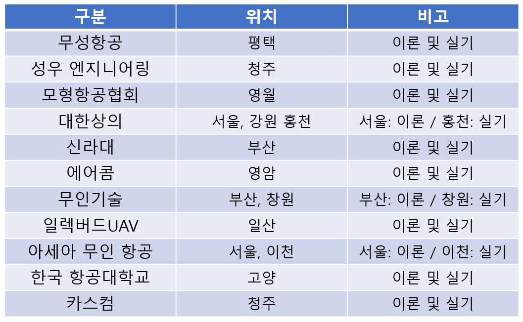 - 참고로 드론 자격증은 인증된 전문 기관에서만 교육을 실시하고 자격증을 받을 수 있습니다. 아래와 같이 기관명과 교육기관 위치 등을 공유해 드리겠습니다. 함께 협업하던 업체들이 많이 있어 색다른 느낌이 드네요.